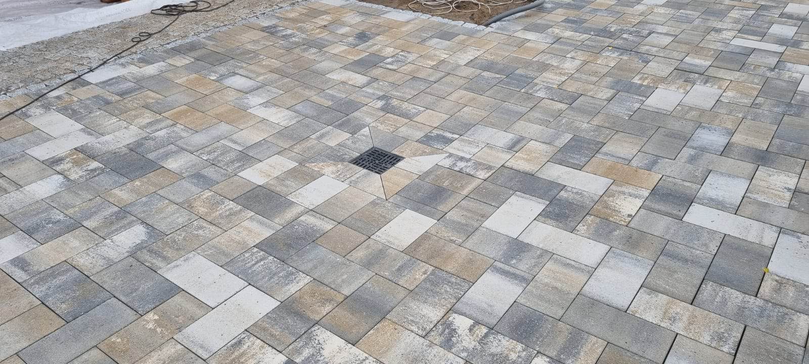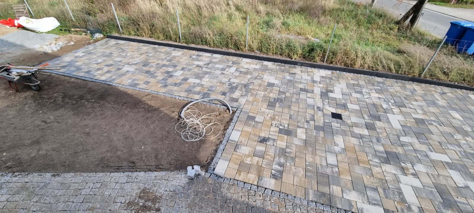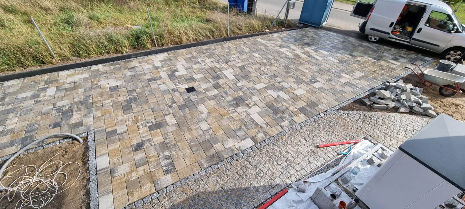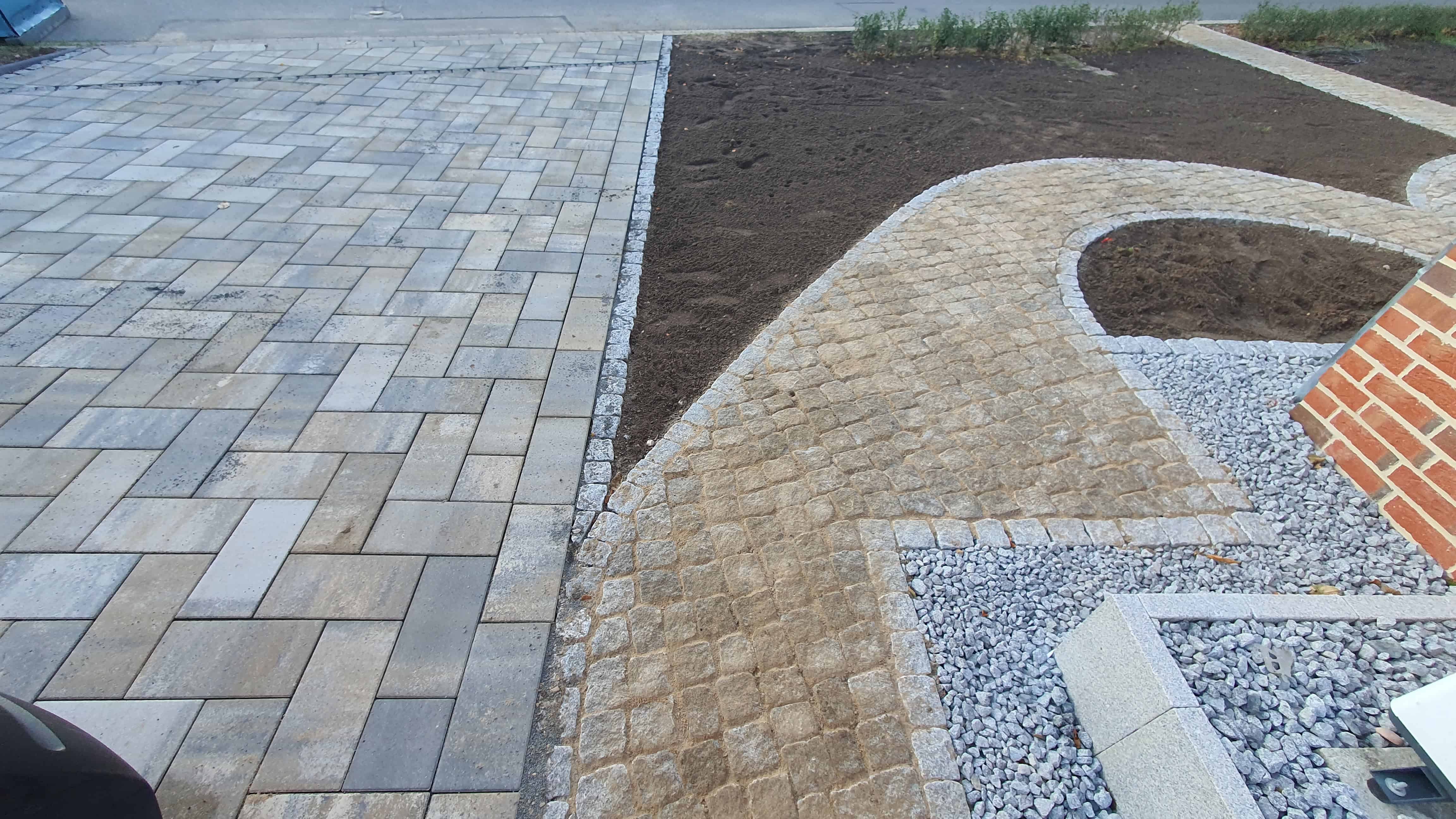 Die geschwungenen Wege führen bis zur Terrasse und binden gleichzeitig den angrenzenden PKW-Stellplatz und die Zufahrt ein. Diese Flächen wurden mit hochwertigem Betonsteinpflaster gestaltet, eingefasst durch Granit, was einen eleganten Kontrast schafft.