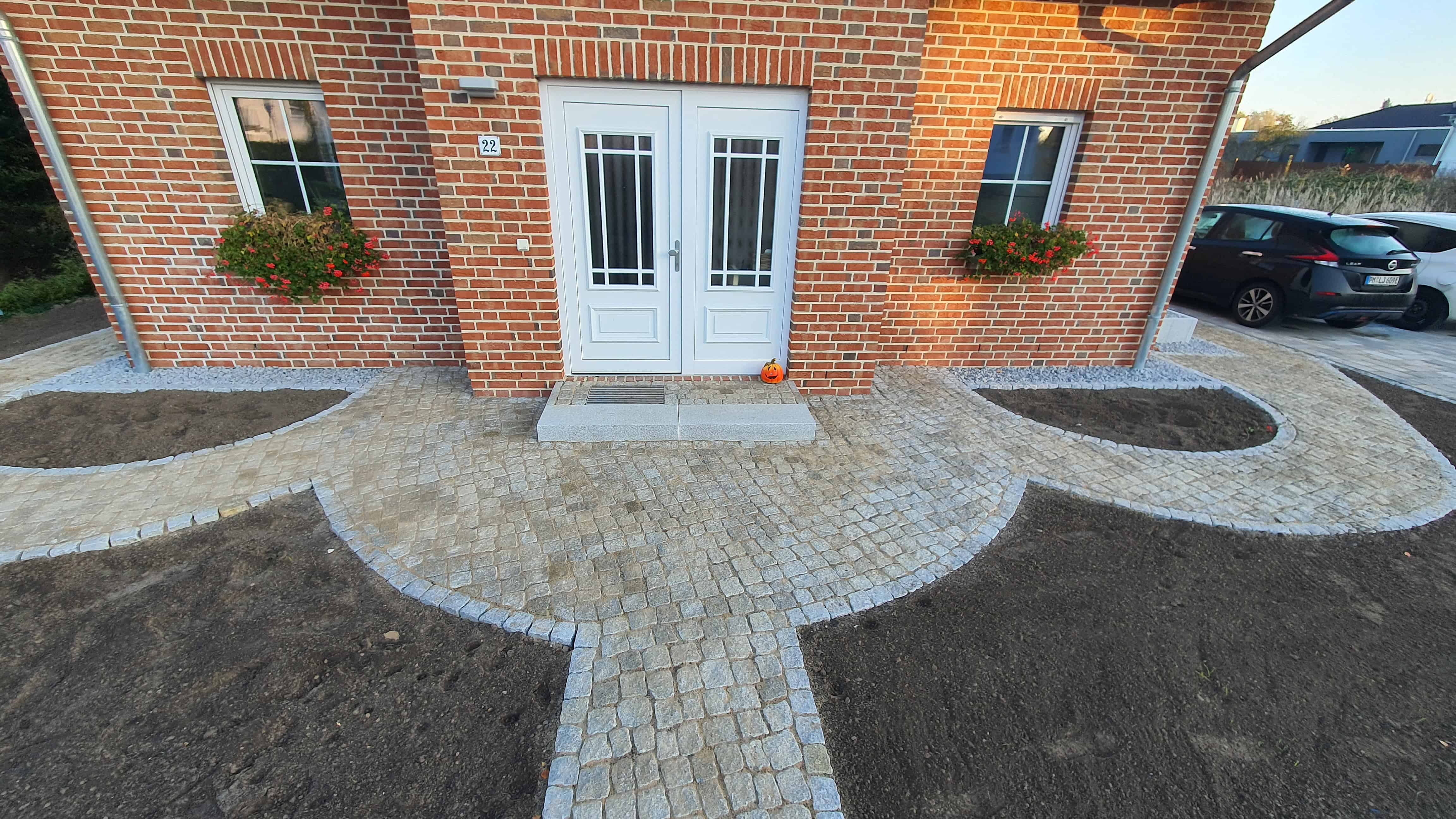 Im Eingangsbereich entstanden geschwungene Wege aus Granitpflaster, die sich harmonisch vor dem von uns gebauten Eingangspodest aus Natursteingranit teilen. Die Granitstufen am Hauseingang bilden einen repräsentativen Zugang, während zwischen Kiestraufe und den Wegen elegante Beete eingefasst wurden, die dem Eingangsbereich eine stilvolle Rahmung verleihen.