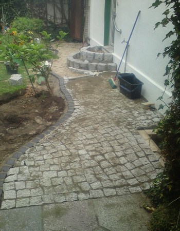 Hier wurde in Bornim Potsdam die Gewege neu gebaut. Unter Einsatz von Granit wurden nicht nur Wege gepflastert sondern auch eine Granittreppe erstellt.